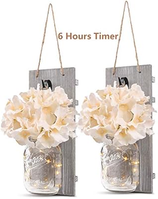 Amazon Com Rustic Wall Sconces Mason Jars Sconce Rustic Home Decor Wrought Iron Hooks Silk Hydrangea And Led Strip Lights Design 6 Hour Timer Home Decoration Set Of 2 Home Kitchen